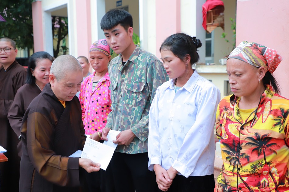 Ni trưởng Thích nữ Nhật Khương trao quà đến những hộ bị ảnh hưởng bão lũ |