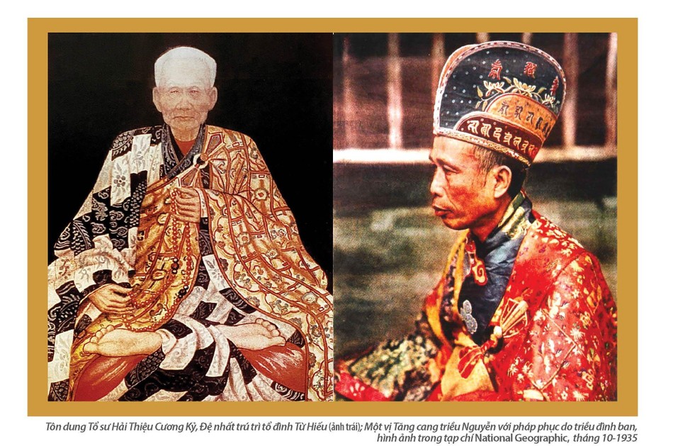 Dưới thời nhà Nguyễn, pháp phục của giới tu sĩ được quy định rõ theo quan chế. Cụ thể, “chức Tăng cang2 được cấp 1 bộ pháp phục gồm 1 cà-sa, một áo hậu 5 màu3, một mão Quan âm, một mão Tỳ-lô có 5 hình Phật4; thiền cụ, 1 đôi giày, một đôi dép. Trụ trì cũng được cấp 1 bộ, các thứ đều như của Tăng cang, riêng áo hậu chỉ có 2 màu. Các pháp phục này được dùng mặc trong các dịp lễ công. Nếu Tăng cang, trụ trì nào bị cách chức hoặc qua đời thì giao lại cho chùa gìn giữ để dùng. Nếu cái nào cũ rách, xét rõ không thể dùng được thì bẩm do thần bộ (Bộ Lễ) xin chế cái khác để theo định chuẩn.”5