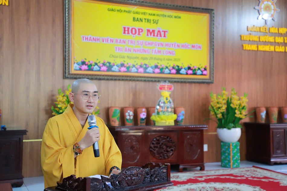 Thượng tọa Thích Thiện Quý phát biểu tri ân những đóng góp của chư tôn đức Tăng Ni H.Hóc Môn đã hoàn thành nhiệm vụ Ban Trị sự GHPGVN TP.HCM giao phó. Thượng tọa cũng hy vọng chính quyền của 4 xã mới tiếp tục hỗ trợ chư Tăng Ni cũng như đồng bào Phật tử trên địa bàn được an tâm sinh hoạt, tu học.