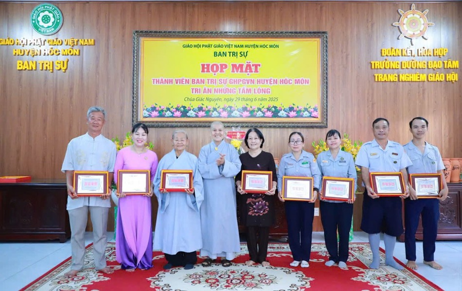 Dịp này, Ban Trị sự GHPGVN H.Hóc Môn tặng Kỷ niệm chương tri ân đến chư tôn đức chứng minh, thành viên Ban Trị sự đã đồng hành, hỗ trợ trong thời gian qua.