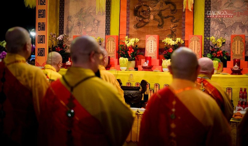 GNO - Theo chương trình của Đại lễ kỳ siêu 18 giờ bắt đầu khóa lễ của chư tôn đức Tăng Phật giáo người Hoa chủ trì trì tụng kinh cầu nguyện tại pháp hội "Hộ quốc Nhân vương" tại Việt Nam Quốc Tự.