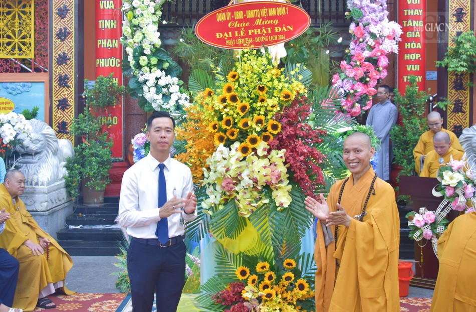 Chào mừng Đại lễ Phật đản Phật lịch 2568 của Phật giáo Q.1, bà Mai Thị Hồng Hoa, Phó Chủ tịch UBND Q.1 phát biểu chúc sức khỏe đến chư Tăng Ni, tín đồ Phật giáo trên địa bàn. Bà cũng ghi nhận, đánh giá cao những thành quả mà Phật giáo Q.1 đã đạt được trong công tác an sinh xã hội thời gian qua và bày tỏ hy vọng Ban Trị sự GHPGVN quận tiếp tục hướng dẫn tín đồ chung sức cùng chính quyền xây dựng quận nhà phát triển hơn.