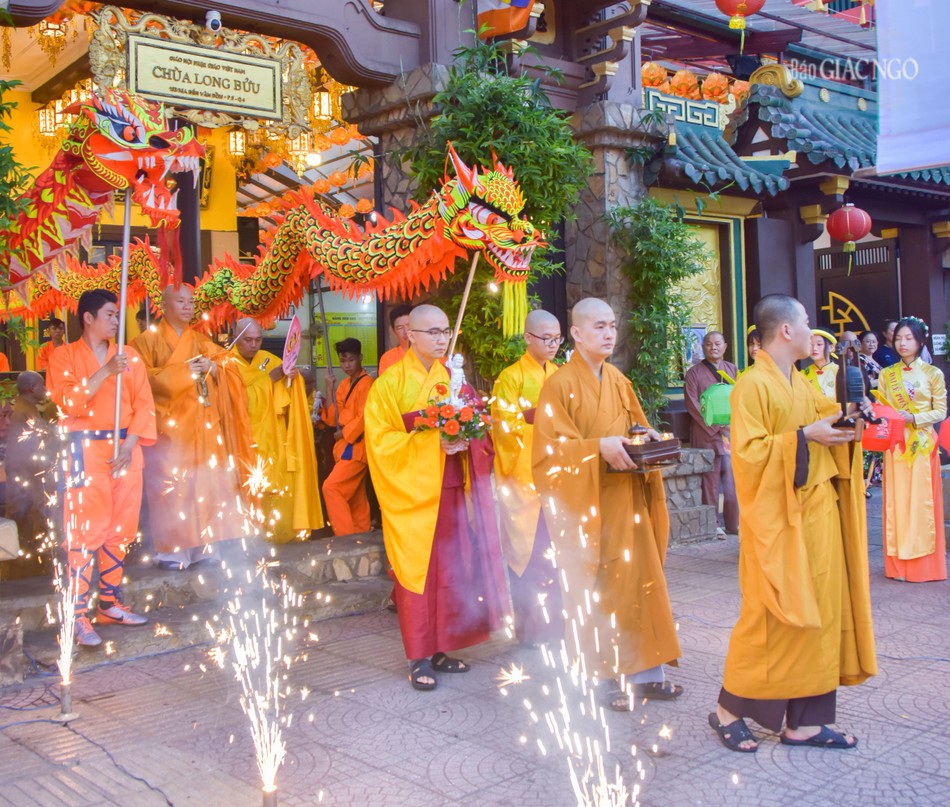 Sau khi thực hiện nghi thức rước kiệu Đức Phật từ Văn phòng Ban Trị sự - chùa Long Bửu về Linh Quang tịnh xá, toàn thể đại chúng tổ chức Đại lễ Phật đản Phật lịch 2568 của Phật giáo Q.4.