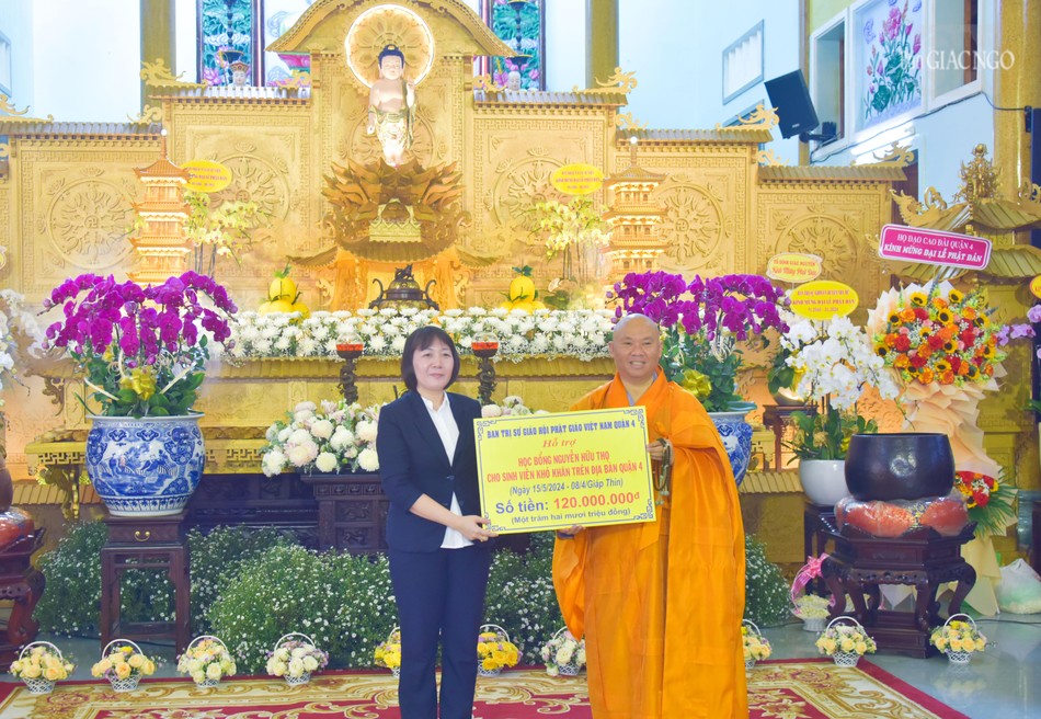 Chào mừng Đại lễ Phật đản, Ban Trị sự GHPGVN Q.4 cũng trao tặng Quỹ học bổng Nguyễn Hữu Thọ, xe đạp hỗ trợ cho các em học sinh, sinh viên có hoàn cảnh khó khăn trên địa bàn quận.
