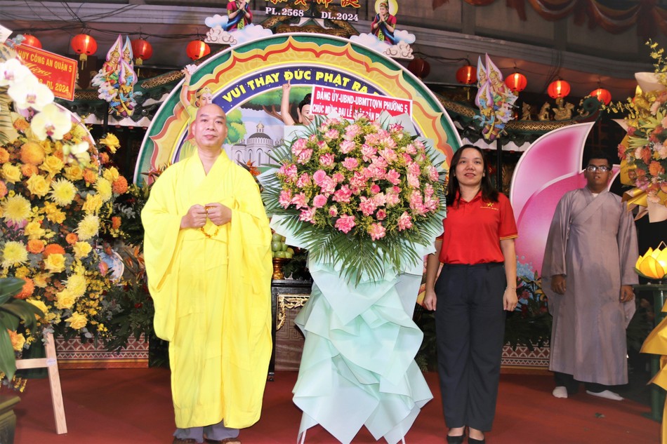Buổi lễ đón nhận nhiều lẵng hoa tươi thắm từ các cấp chính quyền chúc mừng mùa Phật đản nhiều hỷ lạc đến toàn thể Tăng Ni, Phật tử.