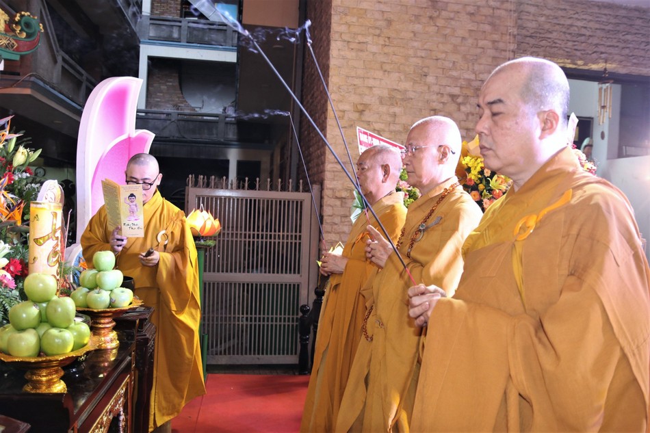 Chư tôn đức đã cử ba hồi chuông trống Bát-nhã rước lễ Đản sanh, niêm hương cúng dường. Đại chúng đã cử hành khóa lễ tụng sám Khánh đản theo truyền thống Bắc tông và Hoa tông.