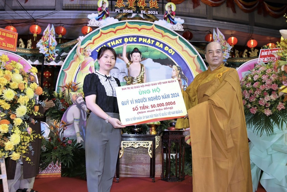 Dịp này, Ban Trị sự GHPGVN Q.5 trao tặng Quỹ "Vì người nghèo", Quỹ "Vì biển đảo quê hương - vì tuyến đầu Tổ quốc năm 2024 - Vì Trường Sa xanh", tổng cộng 120 triệu đồng.