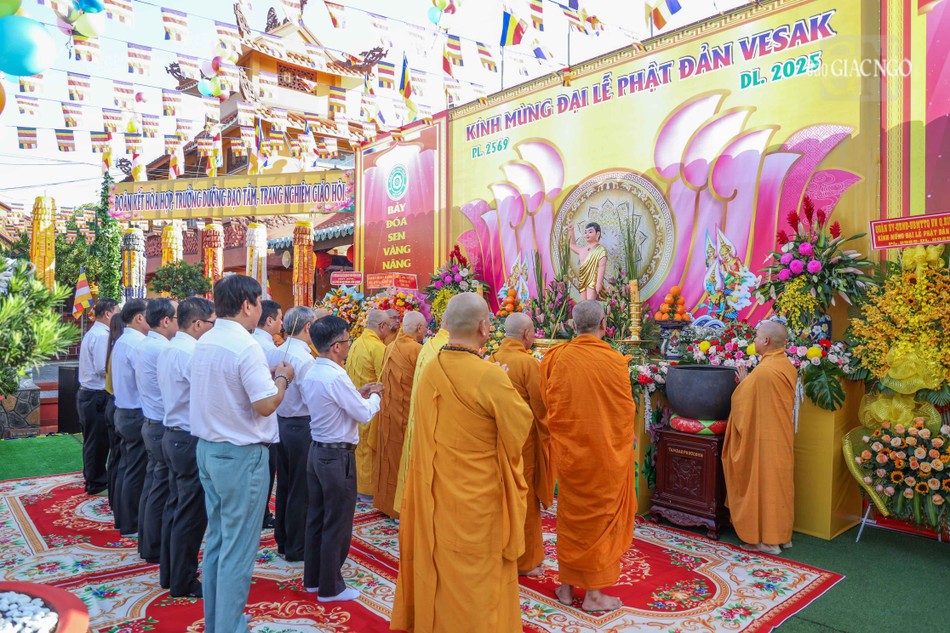 Sau nghi thức cử Quốc ca, Đạo ca, nhập từ bi quán và phần múa dâng hoa cúng dường lên Đức Thế Tôn của các em Gia đình Phật tử, toàn thể đại chúng lắng nghe Trưởng lão Hòa thượng Thích Minh Thông tuyên đọc Thông điệp Đại lễ Phật đản Phật lịch 2569 của Đức Pháp chủ GHPGVN gửi đến toàn thể Tăng Ni, Phật tử Việt Nam trong và ngoài nước.