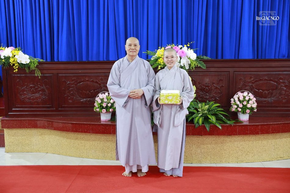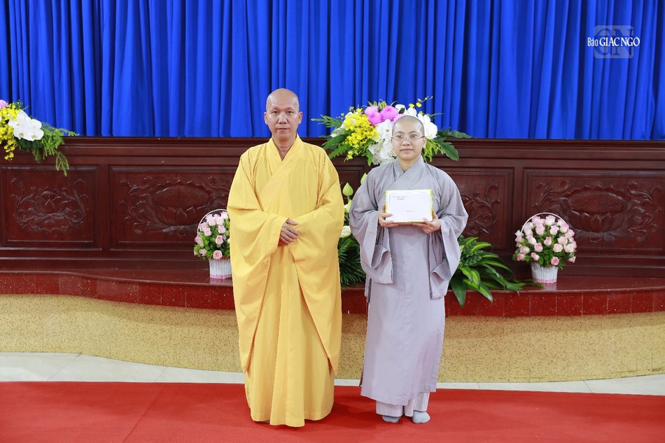 Thượng tọa Thích Tâm Chơn trao giải nhất đến Sư cô Thích nữ Định Tâm Hương với đề tài thi Tứ chánh cần |