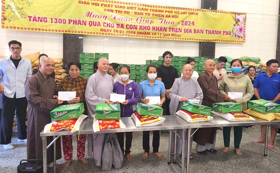 Chư tôn đức đại diện Ban Trị sự GHPGVN TP.HCM và Ban Từ thiện xã hội GHPGVN TP.HCM: Thượng tọa Thích Quang Thạnh, Thượng tọa Thích Thiện Quý, đồng Phó Trưởng ban Trị sự; Thượng tọa Thích Trung Nguyện, Phó Thư ký kiêm Chánh Văn phòng; Đại đức Thích Nguyên Chiếu, Phó ban Từ thiện xã hội GHPGVN TP.HCM; Ni trưởng Thích nữ Từ Nhẫn, Trưởng Phân ban Ni giới GHPGVN TP.HCM, Chứng minh Ban Từ thiện xã hội; Ni trưởng Thích nữ Như Thảo, Phó trưởng Phân ban Ni giới TP.HCM, Phó ban Từ thiện xã hội; Ni sư Thích nữ Huệ Tuyến, Phó ban Từ thiện xã hội, cùng thành viên Ban Từ thiện xã hội GHPGVN TP.HCM đã tổ chức trao quà tại 2 tự viện nhân Tết Giáp Thìn.