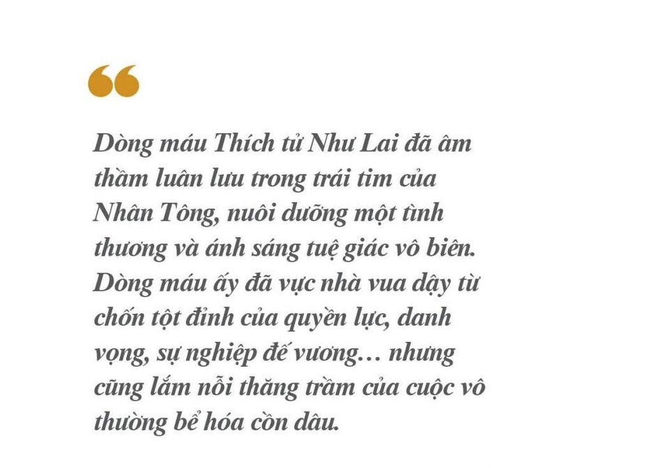 Và còn một dòng máu nữa, dòng máu Thích tử Như Lai đã âm thầm luân lưu trong trái tim của Nhân Tông, nuôi dưỡng một tình thương và ánh sáng tuệ giác vô biên. Dòng máu ấy đã vực nhà vua dậy từ chốn tột đỉnh của quyền lực, danh vọng, sự nghiệp đế vương… nhưng cũng lắm nỗi thăng trầm của cuộc vô thường bể hóa cồn dâu. Chính dòng máu này đã chuyển hóa nhà vua từ một con người bằng xương bằng thịt vượt lên những ham muốn thường tình, trở thành thiền Tăng sống đời thanh đạm, ý chí cao nhàn.