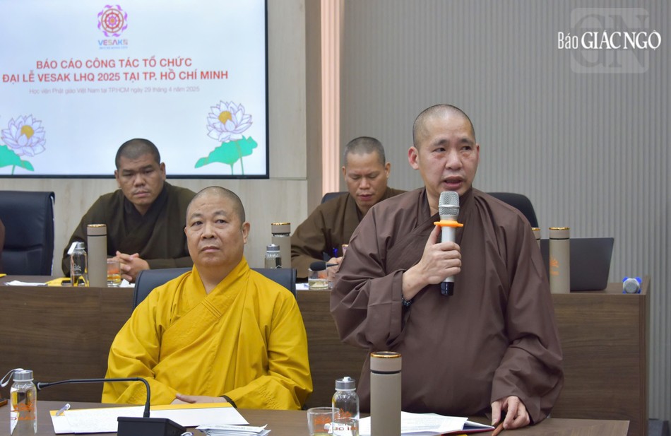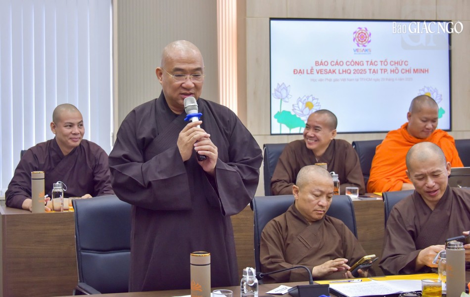 Tiếp đó, Thượng tọa Thích Nhật Từ, Phó Tổng Thư ký Thường trực Ủy ban Tổ chức Quốc gia Đại lễ Vesak Liên Hiệp Quốc 2025 tại Việt Nam đã báo cáo một số công tác chuẩn bị cho Đại lễ. Các hạng mục hình thức trang trí đã và đang được hoàn thiện như: cổng chào, các khu vực diễn ra những hoạt động chính của Đại lễ; các cung đường di chuyển trong và ngoài khuôn viên Học viện cũng như cung đường di chuyển từ sân bay Tân Sơn Nhất về Học viện; pano, áp-phích, khu tiếp đón khách tại sân bay Tân Sơn Nhất v.v…