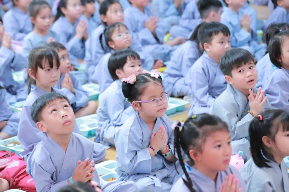 Tại chánh điện, dưới sự hướng dẫn của Ni sư Thích nữ Huệ Đức, trụ trì chùa cùng các Sư cô, các bé nghiêm trang chắp tay lễ Phật, đồng thanh trì tụng câu thần chú của Đức Bồ-tát Quán Thế Âm “Om Mani Padme Hum” và chú của Đức Văn Thù “Om Ah Ra Ba Sa Na Dhi”.