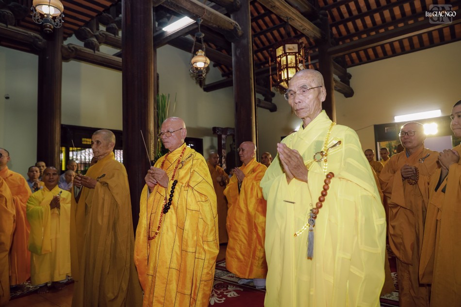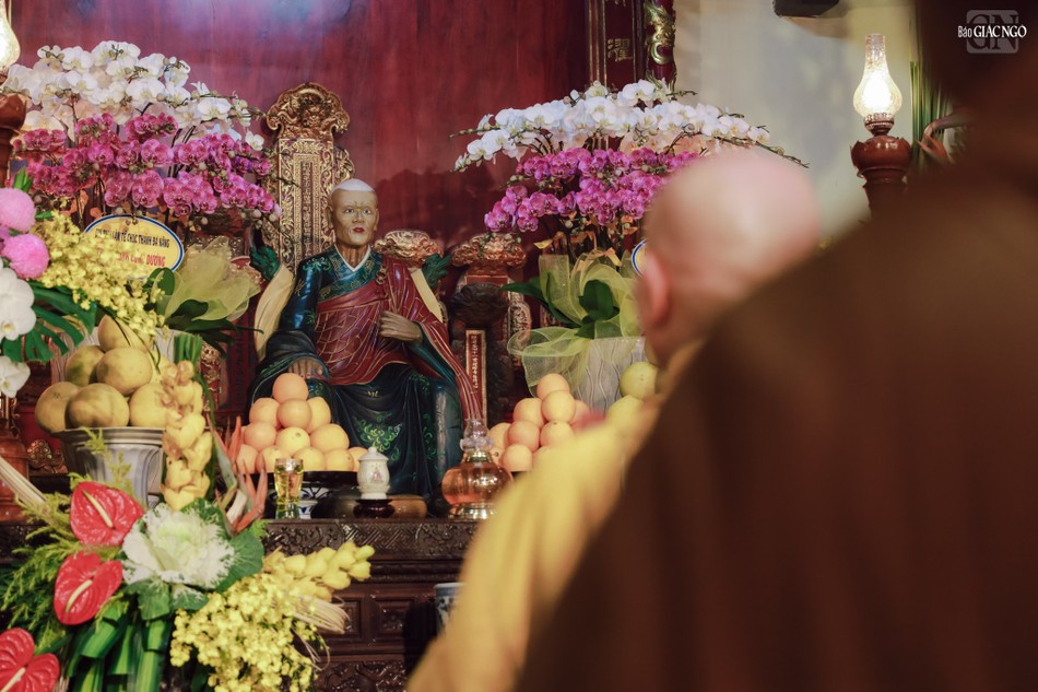 Đối trước hương án, chư Tăng Ni trong môn phong Thiền phái Lâm Tế Chúc Thánh thành kính dâng hương, đảnh lễ Tổ sư Minh Hải Pháp Bảo và lịch đại Tổ sư hoằng truyền Chánh pháp; đồng lắng lòng tưởng niệm, ân đức của bậc Tổ sư.