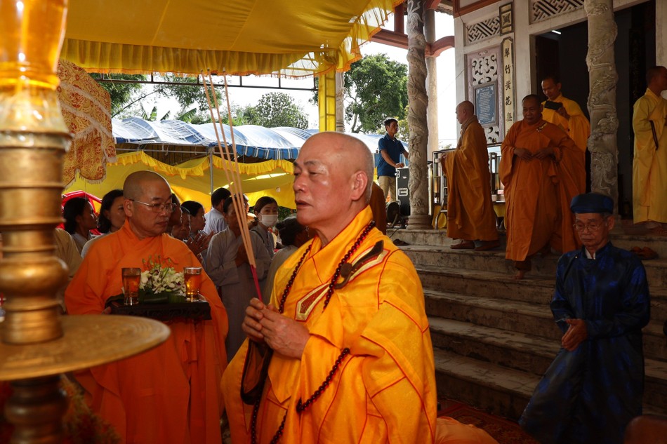 Sau đó, chư tôn đức trang nghiêm niêm hương cầu nguyện, thực hiện nghi thức sái tịnh, chính thức đặt đá khởi công trùng tu tổ đình Sắc tứ Linh Quang.