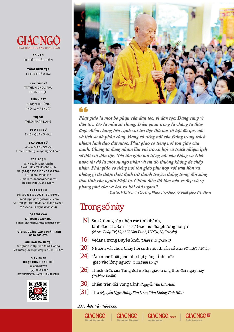 Một nội dung đáng chú ý khác được giới thiệu ở bìa 1 là bài nhận định rất sâu sắc của Hòa thượng Bodhi với tên gọi thân quen là Tỳ-kheo Bodhi, người Mỹ, Tiến sĩ Xã hội học đồng thời là nhà Phật học nổi tiếng thế giới, tác giả của nhiều công trình dịch, nghiên cứu giá trị, là khách mời thuyết trình chính tại Đại lễ Vesak Liên Hiệp Quốc diễn ra ở TP.HCM vừa rồi, về giá trị thực sự của Tăng đoàn và những thách thức mà đoàn thể người xuất gia đang phải đối mặt trong xã hội nặng về hình thức và tiêu thụ hiện nay, qua bài "Thách thức của Tăng đoàn Phật giáo trong thời đại ngày nay", trên chuyên mục Quốc tế.