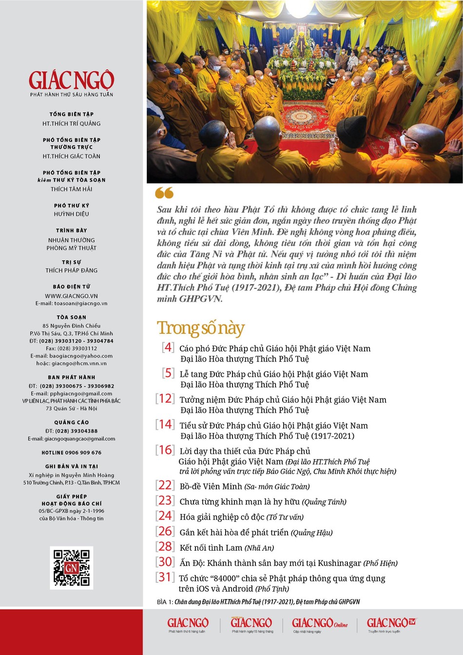 Bên cạnh đó, báo Giác Ngộ tuần này còn có đăng bài về "Tiểu sử Đức Pháp chủ GHPGVN - Đại lão Hòa thượng Thích Phổ Tuệ" (1917-2021); Những dòng thơ tưởng niệm "Bồ-đề Viên Minh" của Sa-môn Giác Toàn; "Lời dạy tha thiết của Đức Đệ tam Pháp chủ GHPGVN" do tác giả Chu Minh Khôi thực hiện vào năm 2016...