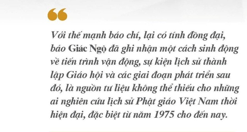 Báo chí được ví như “người thư ký của thời đại”. Với gần tròn 46 năm phát triển, Báo Giác Ngộ đã đảm nhận vai trò ấy của Phật giáo Việt Nam thời hiện đại, trở thành nguồn tư liệu sinh động và có thể nói là đầy đủ nhất khi nghiên cứu về quá trình hình thành, phát triển của Giáo hội Phật giáo Việt Nam, đặc biệt là tiến trình của Hội nghị thống nhất Phật giáo Việt Nam tại thủ đô Hà Nội 40 năm về trước.