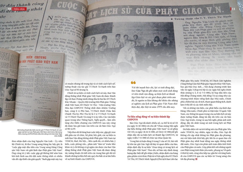 Báo Giác Ngộ đã dành nhiều số, cụ thể là từ số 131 (ra ngày 15-10-1981) với chủ đề “Chào mừng Hội nghị đại biểu thống nhất Phật giáo Việt Nam” và số ghép 132-133, ra ngày 1 & 14-11-1981, số 134 (1-12-1981) để ghi nhận đầy đủ sự kiện lịch sử thành lập GHPGVN, từ ngày 4 đến 7-11-1981 tổ chức tại chùa Quán Sứ.
