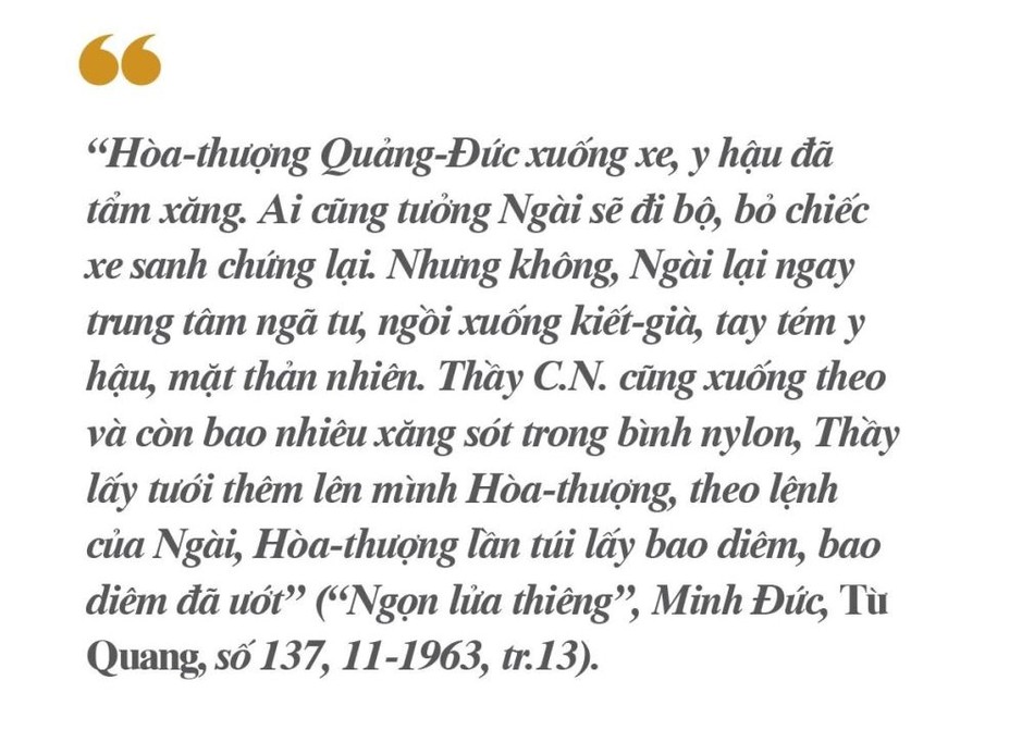 Đoàn rước linh về Xá Lợi đang nghiêm trang, bỗng dừng lại, mọi người đều đổ dồn sự chú ý về chiếc xe Austin chở Ngài Quảng Đức. “Xe lại hỏng máy mà lại hỏng giữa ngã tư, báo hại xe cộ đổ dồn hai đầu càng phút càng thêm đông”. Từ trên chiếc xe đang “nằm đường”, “Hòa-thượng Quảng-Đức xuống xe, y hậu đã tẩm xăng. Ai cũng tưởng Ngài sẽ đi bộ, bỏ chiếc xe sanh chứng lại. Nhưng không, Ngài lại ngay trung tâm ngã tư, ngồi xuống kiết-già, tay tém y hậu, mặt thản nhiên. Thầy C.N. cũng xuống theo và còn bao nhiêu xăng sót trong bình nylon, Thầy lấy tưới thêm lên mình Hòa-thượng, theo lệnh của Ngài, Hòa-thượng lần túi lấy bao diêm, bao diêm đã ướt” (“Ngọn lửa thiêng”, Minh Đức, Từ Quang, số 137, 11-1963, tr.13).