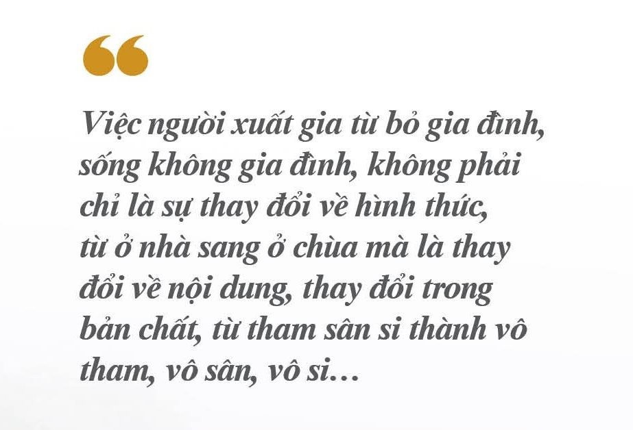Việc từ bỏ gia đình, sống không gia đình, không phải chỉ là sự thay đổi về hình thức, từ ở nhà sang ở chùa mà là thay đổi về nội dung, thay đổi trong bản chất, từ tham sân si… thành vô tham, vô sân, vô si… Nếu ta hiểu thành tựu đạo nghiệp theo kiểu thế gian thì Đức Phật và chư Thánh tăng thời xưa không có ai có đạo nghiệp cả, vì các vị ấy không sở hữu gì cả. Các bậc giác ngộ ấy không có sự nghiệp gì ở thế gian nhưng thật sự đã thành tựu đạo nghiệp.