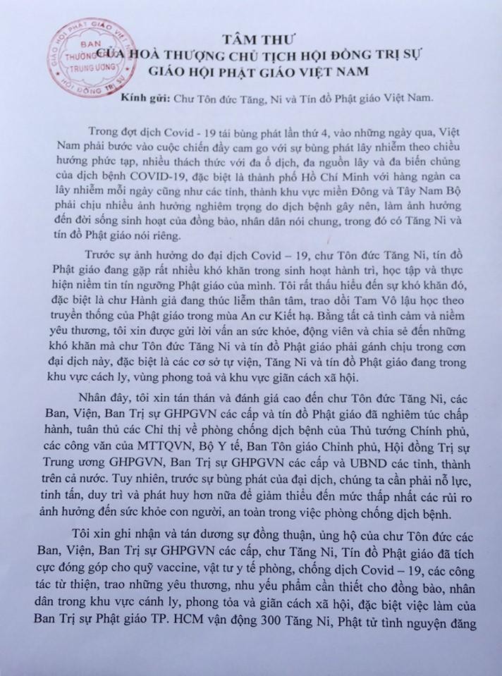 "Trong đợt dịch Covid-19 tái bùng phát lần thứ 4, vào những ngày qua, Việt Nam phải bước vào cuộc chiến đầy cam go với sự bùng phát lây nhiễm theo chiều hướng phức tạp, nhiều thách thức với đa ổ dịch, đa nguồn lây và đa biến chủng của dịch bệnh Covid-19, đặc biệt là Thành phố Hồ Chí Minh với hàng ngàn ca lây nhiễm mỗi ngày cũng như các tỉnh, thành khu vực miền Đông và Tây Nam Bộ phải chịu nhiều ảnh hưởng nghiêm trọng do dịch bệnh gây nên, làm ảnh hưởng đến đời sống sinh hoạt của đồng bào, nhân dân nói chung, trong đó có Tăng Ni và tín đồ Phật giáo nói riêng.