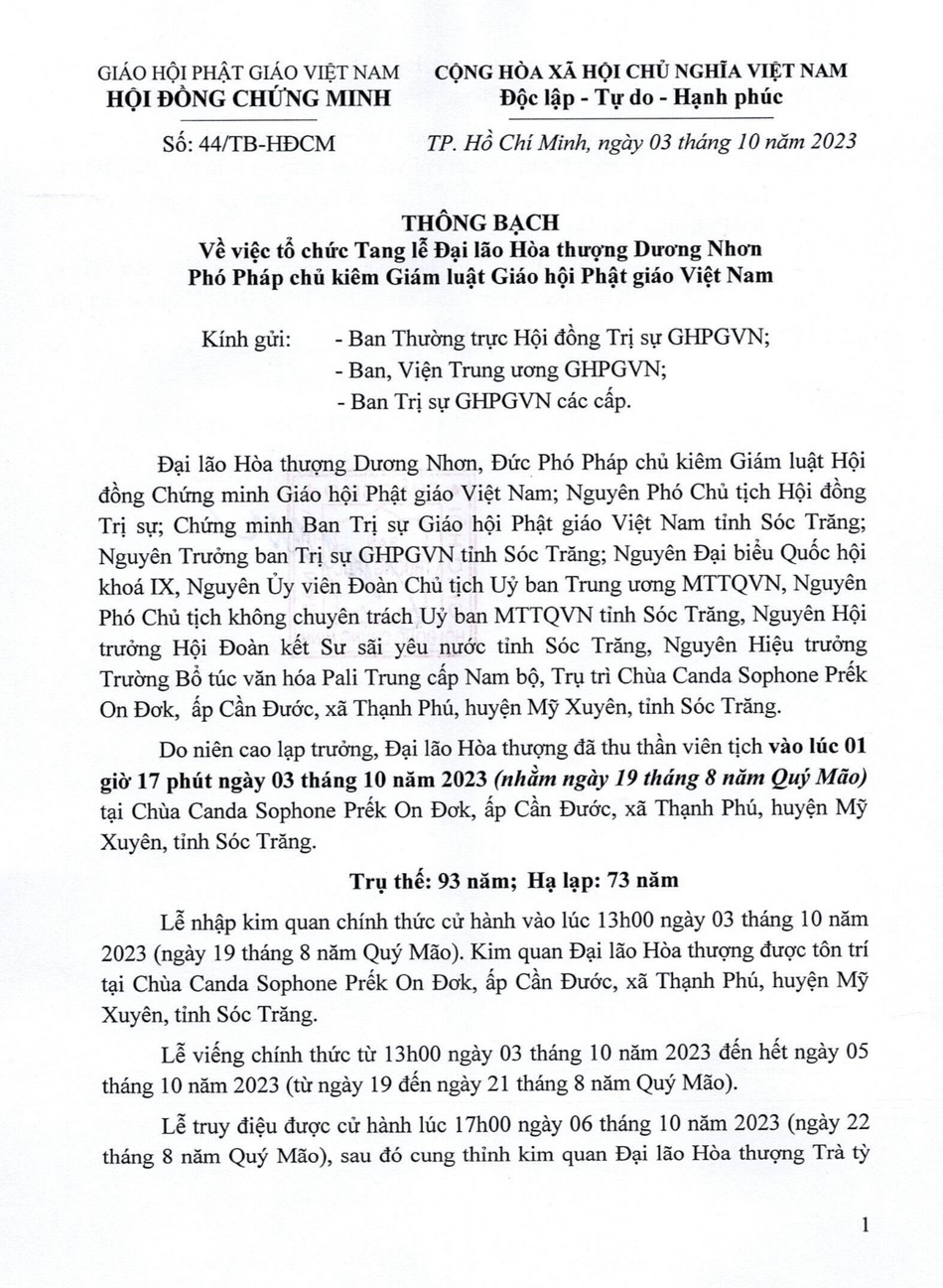 Cùng ngày, Hòa thượng Chủ tịch Hội đồng Trị sự GHPGVN cũng ấn ký cáo phó và thông báo về việc tổ chức tang lễ theo nghi thức cấp cao của GHPGVN.