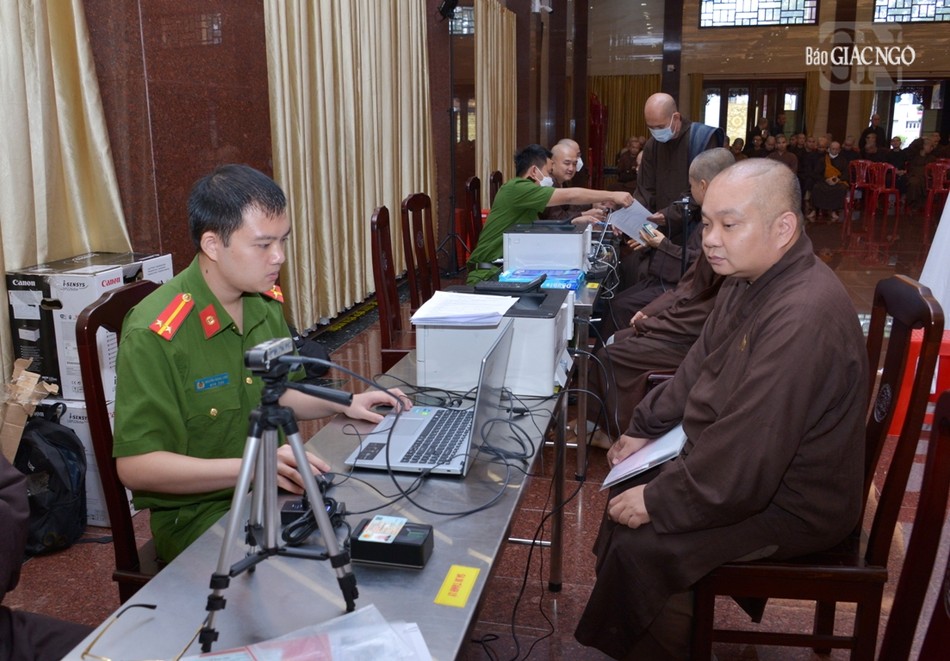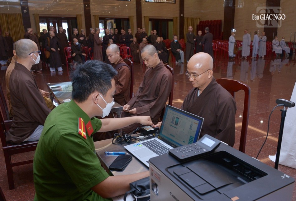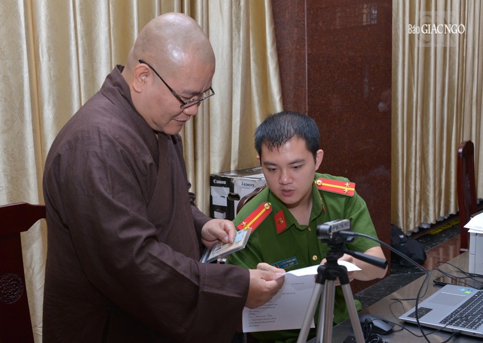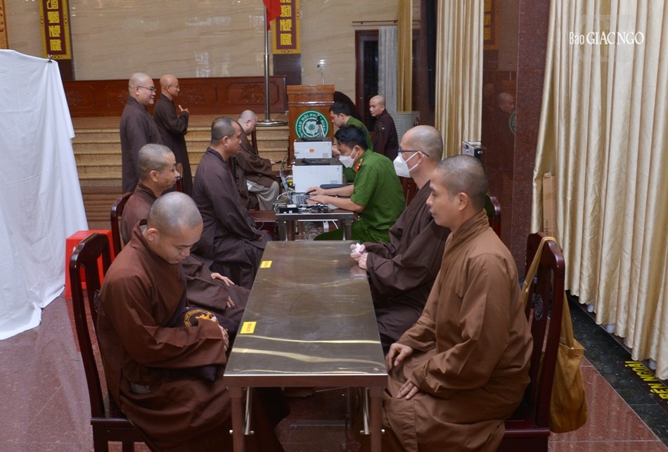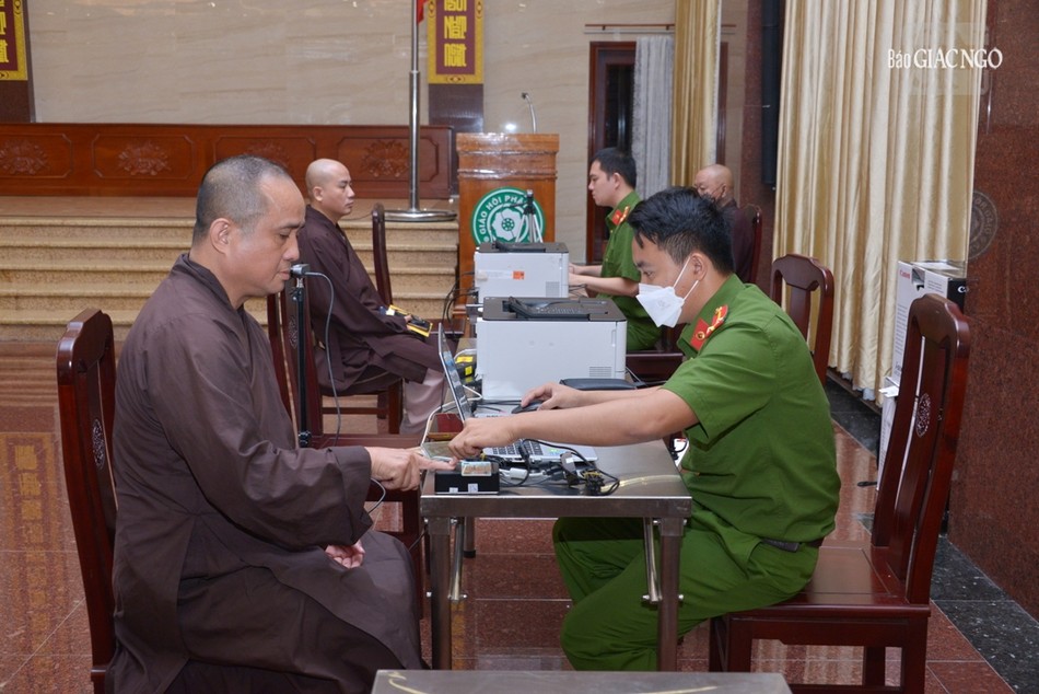 Hòa thượng Thích Lệ Trang, Trưởng ban Trị sự GHPGVN TP.HCM cùng chư tôn đức Ban Thường trực Ban Trị sự hiện diện theo hướng dẫn của cán bộ thuộc Công an TP.HCM thực hiện các thủ tục để đăng ký, kích hoạt tài khoản định danh điện tử mức 1, mức 2.