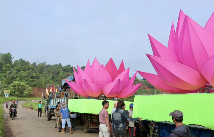 Hoa sen được chư tôn đức và Phật tử vận chuyển từ chùa Phước Quang đến hồ Nhân Cơ |