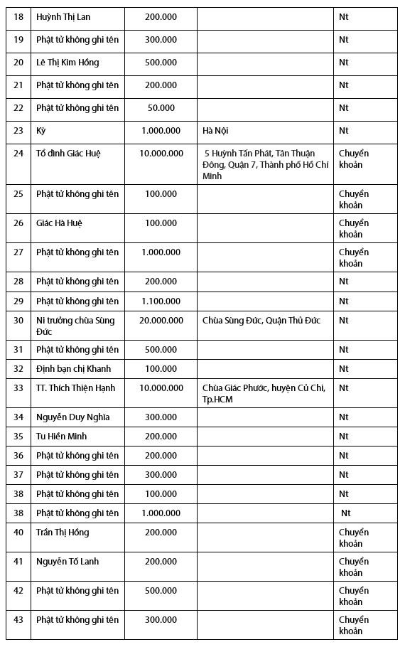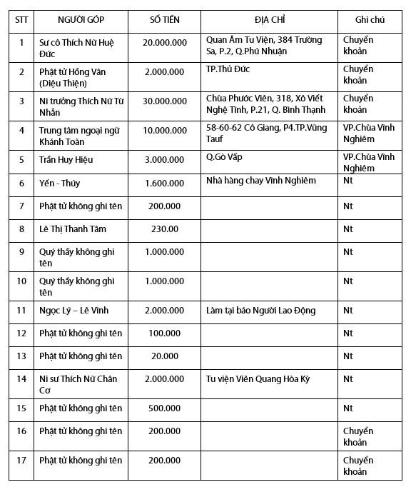 Theo đó, tính đến 19 giờ ngày 10-3-2021, Ban Từ thiện xã hội GHPGVN TP.HCM đã nhận được số tiền 597.670.000 đồng, với danh sách đóng góp cụ thể như sau: