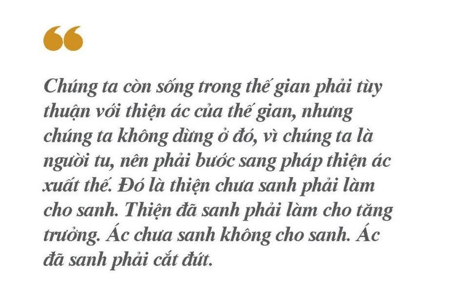 Mình tu, phải bước lên, thực tập pháp thiện ác xuất thế bằng cách đi sâu vào thiền quán. Hồi nãy ta ra thế gian, gặp người, bây giờ trở về cấm túc an cư, không gặp ai, trở về đời sống nội quán là nhìn bên trong, không nhìn bên ngoài, tức thể nghiệm pháp thiện ác trong tâm, hay thiện ác xuất thế. Vì lên Niết-bàn là bỏ thiện ác thế gian, nên Phật dạy thanh tịnh là Niết-bàn, động là sanh tử. Ta ngồi thiền khởi ý niệm nào là động, là ác, là vô minh duyên khởi.