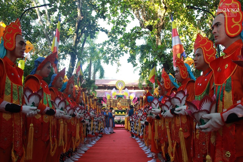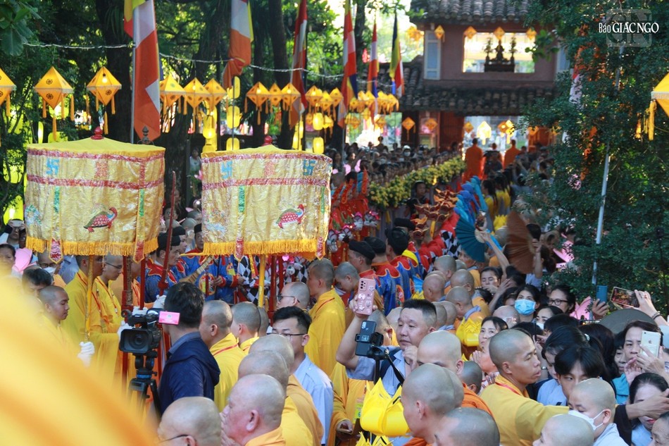 Tiếp theo đó, đoàn cung nghinh cung thỉnh kim thân Đức Phật sơ sinh trên tòa cửu long từ lễ đài qua cổng Tam quan chùa Diệu Đế trước khi tôn trí trên xe hoa.