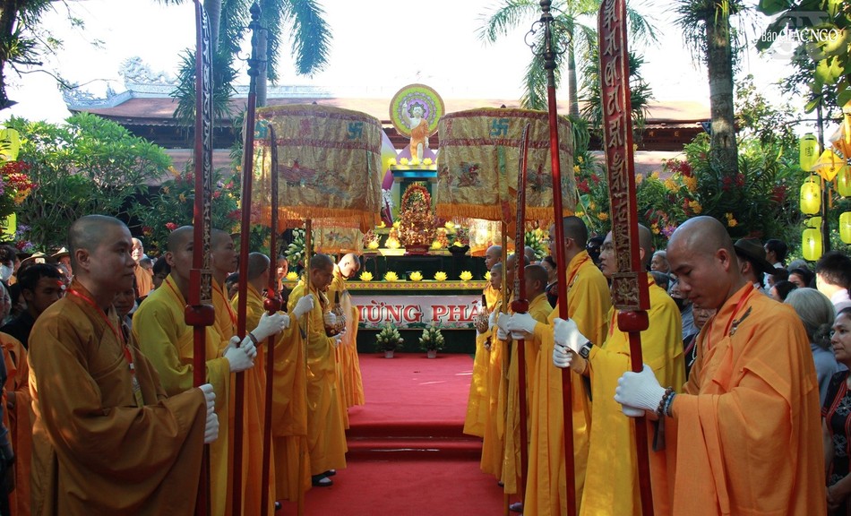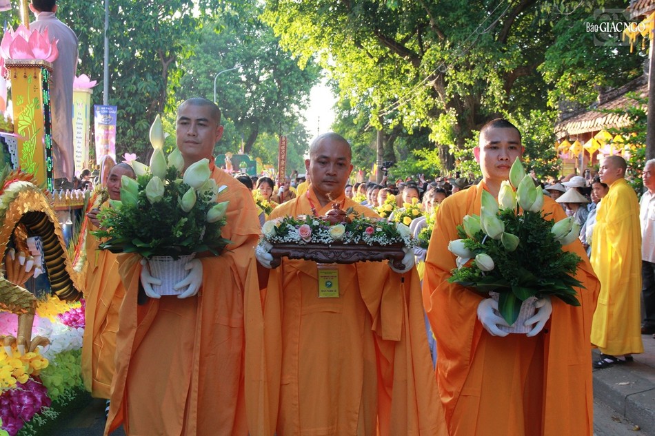 Dẫn đầu đoàn rước là đoàn cờ Tổ quốc và cờ Phật giáo, tiếp đến là xe lư trầm, xe chuông trống Bát-nhã, đoàn thiếu nữ dâng hoa, đoàn bê tích pháp hiệu, đoàn chư thiên mặc áo bá nạp, áo mã tiên, đội nhã nhạc ngũ lôi, tiếp theo là tôn tượng của Đức Phật sơ sinh được tôn trí trên đài xe hoa, sau xe hoa là chư Tăng Ni, Phật tử… Đoàn rước cung nghinh đến tam quan Diệu Đế quốc tự ra đường Bạch Đằng và tiếp theo rước bằng xe hoa.