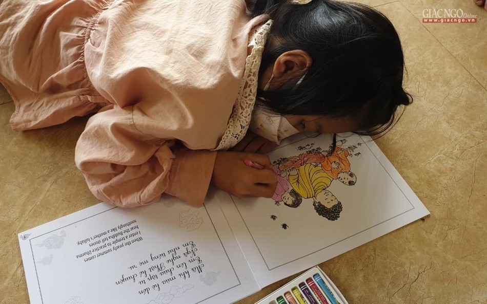 Dịp này, quý Thầy cũng đã hướng dẫn cho các em vẽ dán tranh, tô màu, cắm hoa và sau đó thưởng thức những món ăn nhẹ, trong ngày hoan hỷ đón mừng Khánh đản của Đức Thế Tôn.