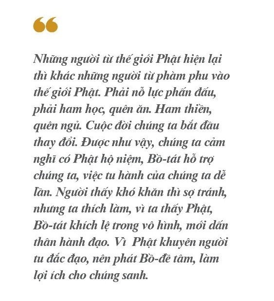 Những người từ thế giới Phật hiện lại thì khác những người từ phàm phu vào thế giới Phật. Phải nỗ lực phấn đấu, phải ham học, quên ăn. Ham thiền, quên ngủ. Cuộc đời chúng ta bắt đầu thay đổi. Được như vậy, chúng ta cảm nghĩ có Phật hộ niệm, Bồ-tát hỗ trợ chúng ta, việc tu hành của chúng ta dễ lần. Người thấy khó khăn thì sợ tránh, nhưng ta thích làm, vì ta thấy Phật, Bồ-tát khích lệ trong vô hình, mới dấn thân hành đạo. Vì Phật khuyên người tu đắc đạo, nên phát Bồ-đề tâm, làm lợi ích cho chúng sanh. Chính vì vậy, kinh Vô lượng nghĩa nói điều thứ nhất của người tu là phải có đạo đức, thứ hai phải có trí tuệ và thứ ba, làm lợi ích cho nhiều người. Làm đúng ba điều này, chúng ta được Phật hộ niệm.