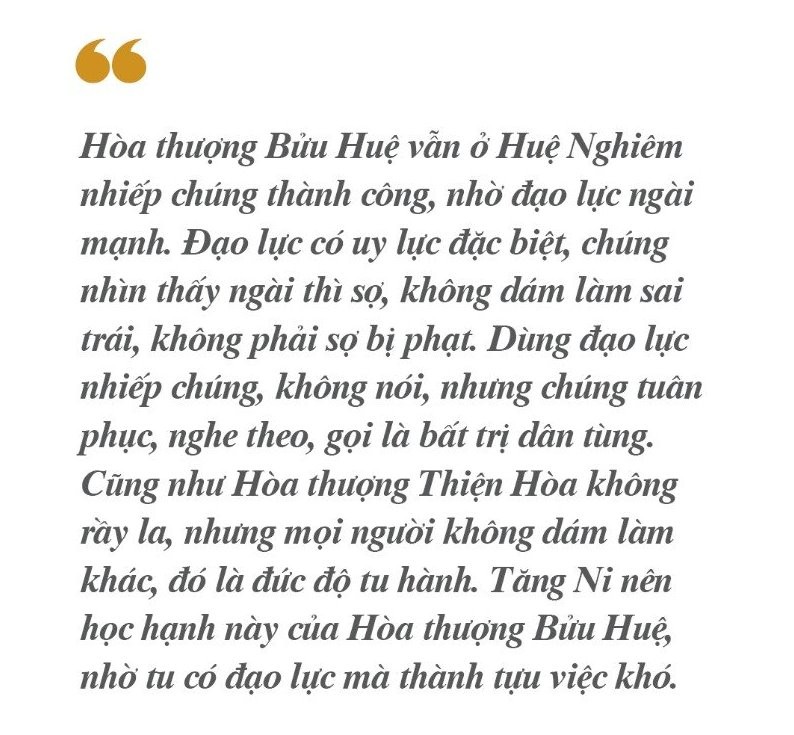 Cũng như Hòa thượng Thiện Hòa không rầy la, nhưng mọi người không dám làm khác, đó là đức độ tu hành. Tăng Ni nên học hạnh này của Hòa thượng Bửu Huệ, nhờ tu có đạo lực mà thành tựu việc khó. Ngài đào tạo được lớp học trò giỏi như Hòa thượng Thiện Nhơn, Hòa thượng Minh Thông...