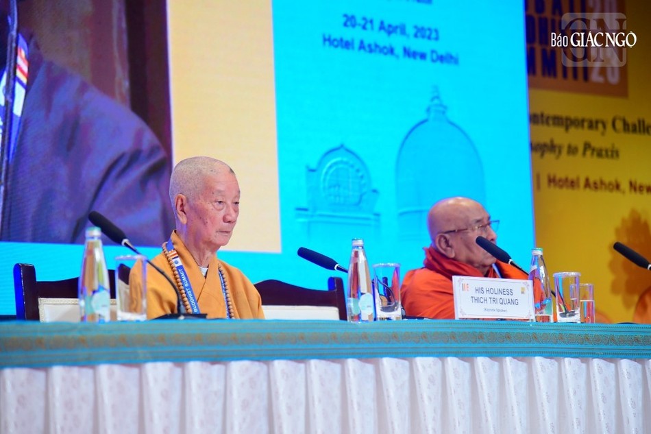 "Thời gian qua, chúng ta đã chứng kiến sự hủy diệt tàn khốc của đại dịch Covid-19; thêm vào đó là chiến tranh kinh hoàng ở một vài quốc gia; sự biến đổi khí hậu khiến thế giới hứng chịu nhiều thảm họa thiên tai, gây tử vong cho biết bao sinh mạng quý giá, đời sống bị xáo trộn, nhiều mất mát đau thương cho nhân loại… Hận thù và tham lam đã làm cho nhân loại vốn khổ đau lại càng đau khổ. Hôm nay, ở đây, trên quê hương của Đức Thích Ca Mâu Ni muôn đời tôn kính, là những người đệ tử Phật, chúng ta cùng nhau thảo luận, tìm ra phương hướng giúp nhân loại sống hòa bình, an lạc, hạnh phúc như Ngài thường dạy: 'Vì hạnh phúc, vì an lạc cho chư Thiên và loài người'", Đức Pháp chủ chia sẻ trong thông điệp của mình trước đại biểu của hơn 30 quốc gia và vùng lãnh thổ tham dự Hội nghị Thượng đỉnh Phật giáo Toàn cầu năm 2023.