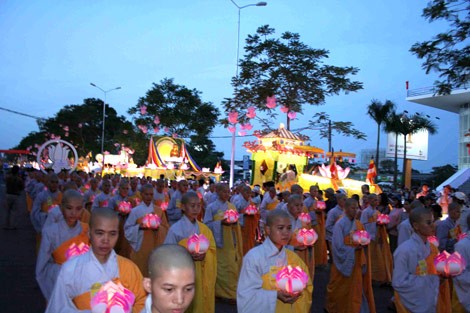 Đoàn rước Phật đi từ chùa Diệu Đế lên chùa Từ Đàm, lộ trình ước chừng 4km, với hàng vạn người tham dự, trên mình mặc y phục chỉnh tề có in logo Đại lễ Phật đản LHQ 2008 tại Huế, trên tay có cầm lồng đèn nến được thắp sáng, đã tạo thành một dòng ánh sáng lung linh huyền ảo dài vô tận.