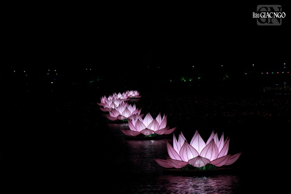 Trong không khí trang nghiêm, đại chúng đã lắng long hướng theo từng ánh sáng được thắp lên trong 7 đóa sen lung linh, huyền ảo trên dòng Hương giang, đón mừng một mùa Phật đản đang về với mỗi người con Phật.