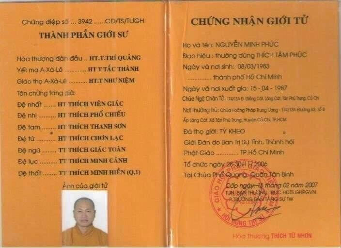 Những giấy tờ mang tên "Thích Tâm Phúc" trên được Văn phòng 2 Trung ương GHPGVN xác nhận là không có trong lưu trữ của Hội đồng Trị sự GHPGVN |
