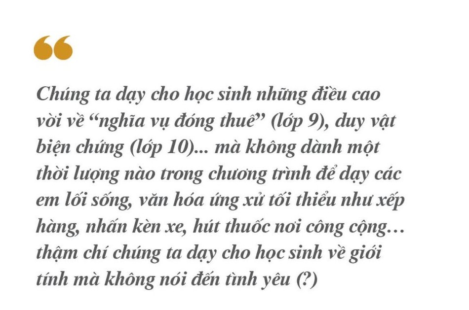 Trong khi chúng ta mải mê truyền thụ kiến thức theo chủ trương, những bài học đức dục vô tình đã bị xem nhẹ. Chúng ta dạy cho học sinh những điều cao vời về “nghĩa vụ đóng thuế” (lớp 9), duy vật biện chứng (lớp 10)... mà không dành một thời lượng nào trong chương trình để dạy các em lối sống, văn hóa ứng xử tối thiểu như xếp hàng, nhấn kèn xe, hút thuốc nơi công cộng… thậm chí chúng ta dạy cho học sinh về giới tính mà không nói đến tình yêu (?). Chẳng trách học sinh bây giờ có những em thực dụng đến lạnh lùng trong tình yêu, hay lầm lạc theo vật chất mà không nghĩ đến hậu quả. Điều đó sẽ để lại những di hại nặng nề cho xã hội và sự nghiệp xây dựng xã hội văn minh.