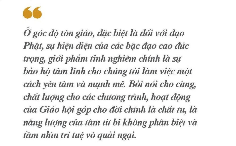 Điều tôi thấy thật may mắn là trong tất cả các Phật sự luôn có sự hiện diện trực tiếp hoặc gián tiếp của chư tôn Trưởng lão, các bậc giáo phẩm của các truyền thống, hệ phái trong ngôi nhà Phật giáo Việt Nam. Ở góc độ tôn giáo, đặc biệt là đối với đạo Phật, sự hiện diện của các bậc đạo cao đức trọng, giới phẩm tinh nghiêm chính là sự bảo hộ tâm linh cho chúng tôi làm việc một cách yên tâm và mạnh mẽ. Bởi nói cho cùng, chất lượng cho các chương trình, hoạt động của Giáo hội góp cho đời chính là chất tu, là năng lượng của tâm từ bi không phân biệt và tầm nhìn trí tuệ vô quải ngại. Đó cũng là điều mà chúng ta thấy được qua đại dịch Covid-19, thể hiện một cách sinh động trong và sau đợt bùng phát khốc liệt nhất không chỉ cho TP.HCM mà ảnh hưởng lên cả nước, và chính trong hoàn cảnh thực tại đó, chúng ta thấy rõ nhất sức mạnh của tình thương yêu, đùm bọc lẫn nhau thật cảm động của người Việt. Đó cũng chính là sức mạnh lớn để Việt Nam vươn lên mỗi khi gặp hoàn cảnh khó khăn và trở nên hùng cường.