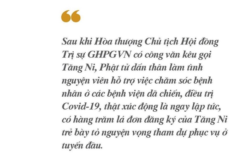 Không thể kể hết từng chi tiết, nhưng ấn tượng nhất, với tôi, là những Tăng Ni, Phật tử tham gia lực lượng tuyến đầu. Họ đã cùng với đội ngũ y tế, các y bác sĩ chung một tấm lòng chăm sóc cho người bệnh để họ sớm phục hồi. Khi đến thăm, nghe và thấy việc làm của đội ngũ này, đặc biệt là các tình nguyện viên là Tăng Ni trẻ, tôi thực sự xúc động về chất tu đã thấm chuyển hóa thành sự tận tụy vô tư. Tôi cũng cảm nhận rất cụ thể về tình người và năng lượng vô biên của tinh thần phụng sự, không gì có thể so sánh và diễn đạt được.