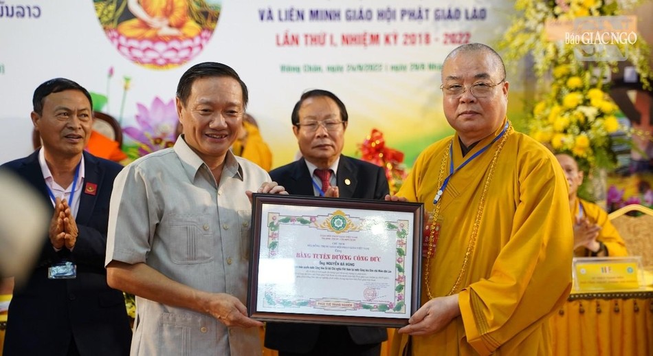 Chứng minh có Hòa thượng Thích Thiện Nhơn, Chủ tịch Hội đồng Trị sự GHPGVN; Hòa thượng Bounma Simavong, Chủ tịch Liên minh Giáo hội Phật giáo Lào.