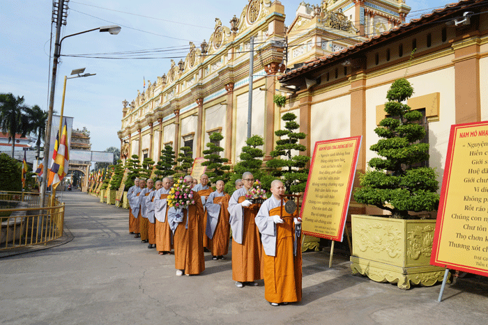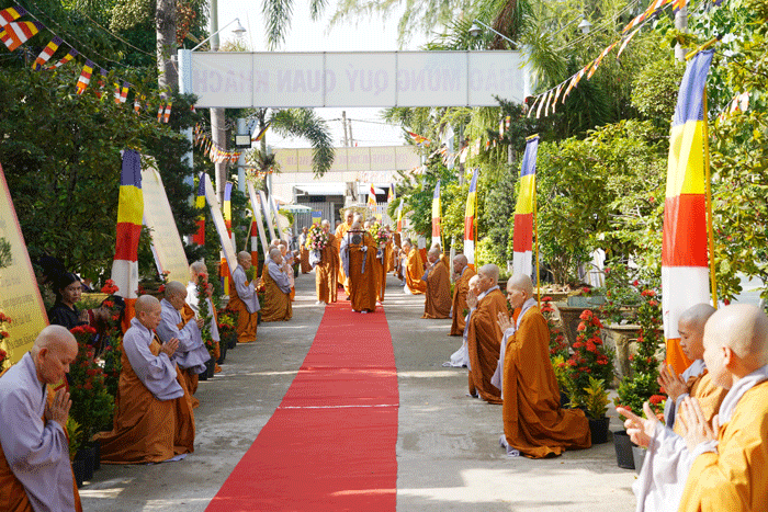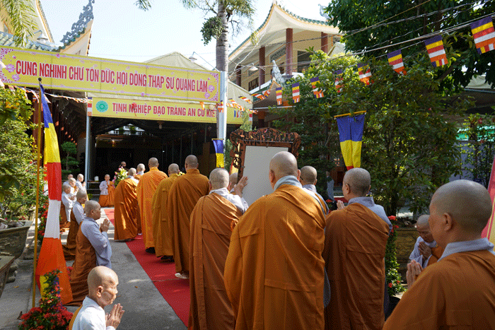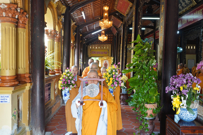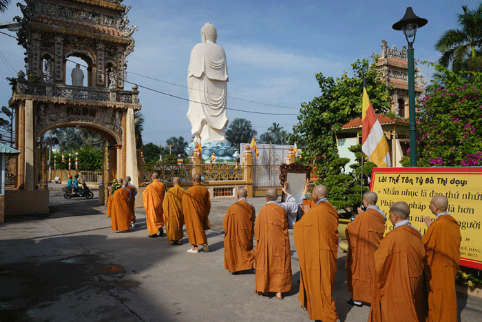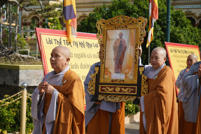GNO - Sáng 4-8 (18-6-Quý Mão), Ban Kiến đàn cùng Hội đồng Thập sư Ni thực hiện nghi thức cung thỉnh pháp tướng Tổ sư Huệ Đăng, tôn hiệu Đại giới đàn do Ban Trị sự tỉnh tổ chức, từ chùa Vĩnh Tràng (giới đàn Tăng) đến tôn trí tại giới đàn Ni - chùa Thiên Phước (TP.Mỹ Tho).