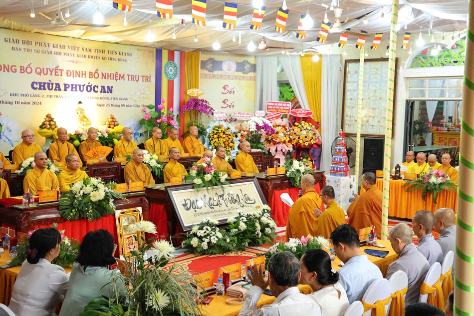 Tại buổi lễ, Đại đức Thích Đức Minh, Phó Thư ký kiêm Chánh Văn phòng Ban Trị sự GHPGVN tỉnh đọc Quyết định số 030/QĐ-BTS ngày 4-10-2024 của Ban Trị sự GHPGVN tỉnh Tiền Giang về việc bổ nhiệm Đại đức Thích Thiện Chí, thế danh Trần Thanh Tùng, sinh 1989 đảm nhiệm trụ trì chùa Phước An.