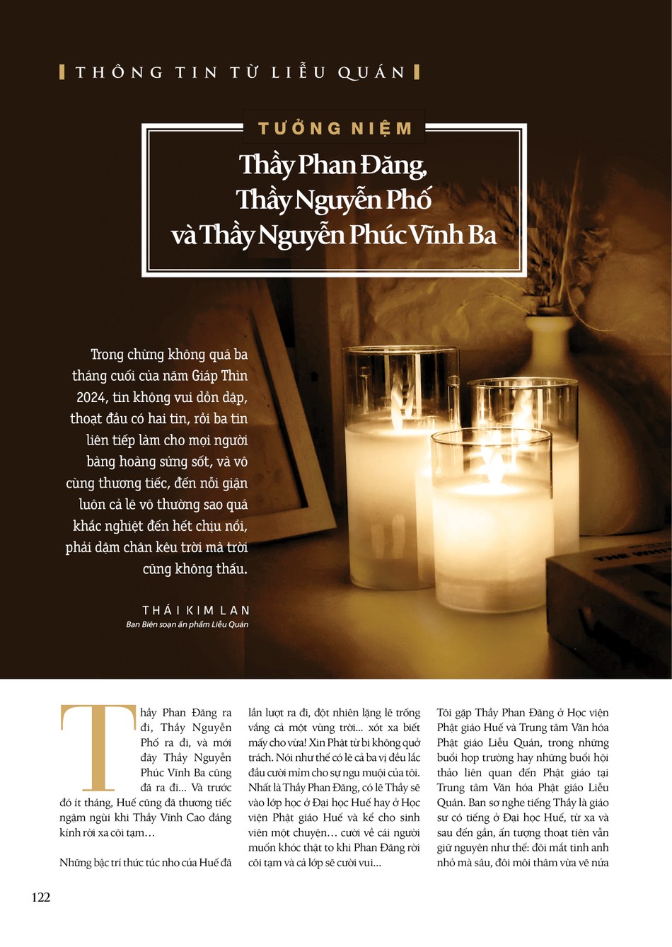 Cũng trong số này, Liễu Quán dành phần nội dung tưởng niệm và tri ân đến quý vị Cư sĩ, trí thức như: thầy Phan Đăng, thầy Nguyễn Phố, thầy Nguyễn Phúc Vĩnh Ba. Các thầy đã đồng hành cùng ấn phẩm Liễu Quán suốt một chặng đường dài từ năm 2014 đến nay, cũng là những tên tuổi đã có nhiều cống hiến đắc lực cho sự nghiệp văn hóa, giáo dục của Phật giáo nước nhà.