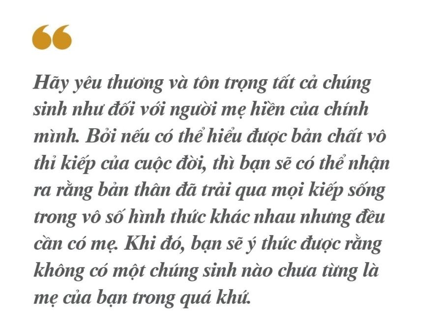 Vì vậy, hãy yêu thương và tôn trọng tất cả chúng sinh như đối với người mẹ hiền của chính mình. Bởi nếu có thể hiểu được bản chất vô thỉ kiếp của cuộc đời, thì bạn sẽ có thể nhận ra rằng bản thân đã trải qua mọi kiếp sống trong vô số hình thức khác nhau nhưng đều cần có mẹ. Khi đó, bạn sẽ ý thức được rằng không có một chúng sinh nào chưa từng là mẹ của bạn trong quá khứ.