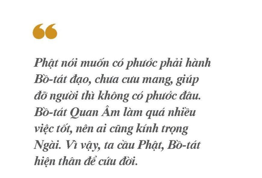 Phật nói muốn có phước phải hành Bồ-tát đạo, chưa cưu mang, giúp đỡ người thì không có phước đâu. Bồ-tát Quan Âm làm quá nhiều việc tốt, nên ai cũng kính trọng Ngài. Vì vậy, ta cầu Phật, Bồ-tát hiện thân để cứu đời.