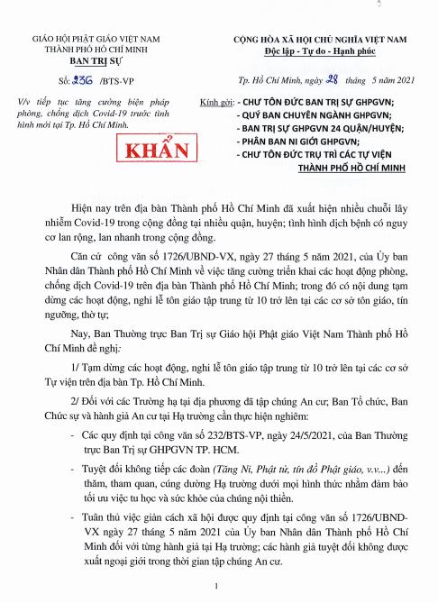 Công văn khẩn gửi đến chư tôn đức Ban Trị sự GHPGVN, các ban chuyên ngành GHPGVN, Ban Trị sự GHPGVN 24 quận huyện; Phân ban Ni giới GHPGVN; chư tôn đức trụ trì các tự viện trên địa bàn TP.HCM